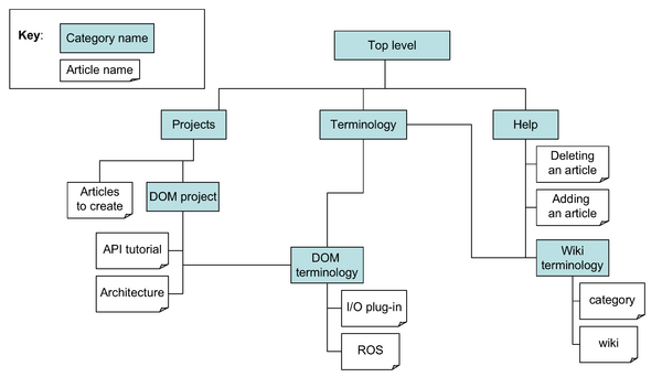 This example shows the top-level category, which is named top level. It's just an arbitrary name chosen for the top of this wiki's hierarchy (and it can be changed). This category contains other categories, including projects, terminology, and help. Each of those categories, in turn, contains other categories or articles.