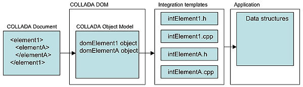 To convert data contained in COLLADA DOM objects into your own application's data structures, the DOM provides integration templates for every object. The integration templates include plug-in points where you can insert conversion code (otherwise, the templates do nothing). After a COLLADA document has been imported by the DOM into COLLADA DOM objects, the DOM calls your conversion code to convert between the DOM objects and the application's data structures.