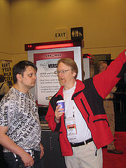 464 KB | COLLADA booth at GDC 2007. COLLADA chair Mark Barnes (right). Photographer: Elizabeth Riegel Color corrected, contrast, cropped. Category:Event photos |