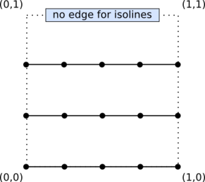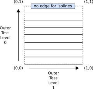 The space of the abstract patch of isolines is a square, but the abstract patch itself is a series of horizontal lines. Only the first two outer tessellation levels are used. The inner tessellation levels are ignored. The two outer tessellation levels apply to the edges as shown in the diagram.